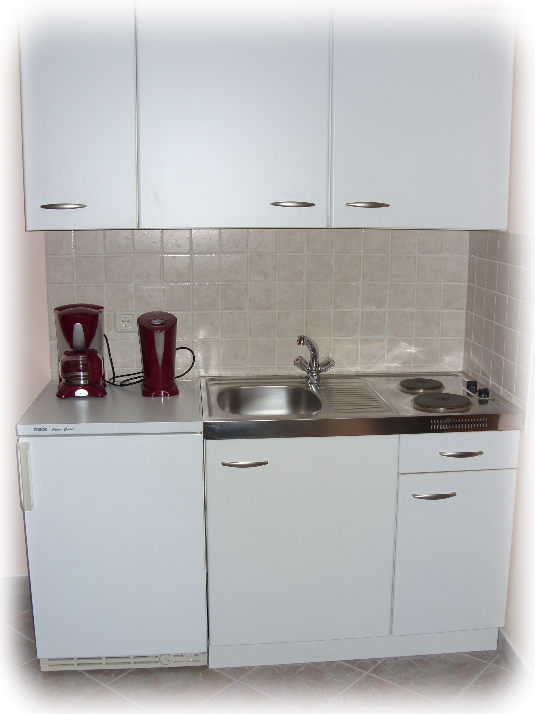 Die Küchenzeile ist mit Kühlschrank, Kaffeemaschine, Wasserkocher, Toaster, Spüle, Kochmöglichkeit, sowie Geschirr und Besteck ausgestattet.