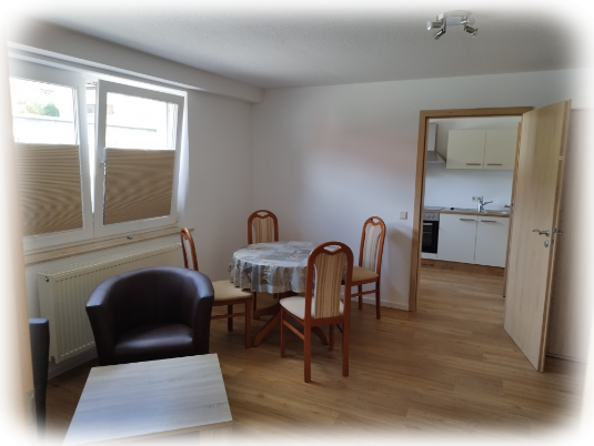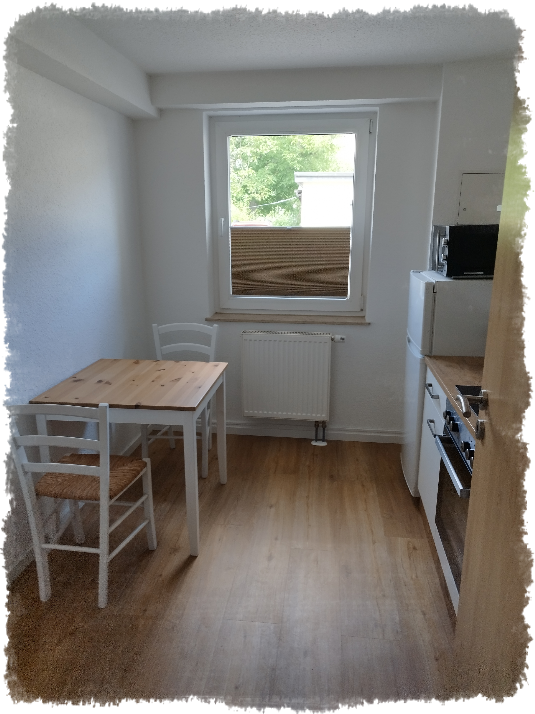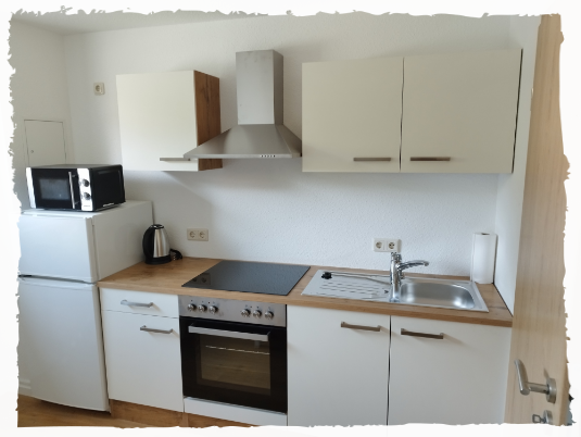 sowie Geschirr, Besteck und einer Sitzecke für 2 Personen ausgestattet.