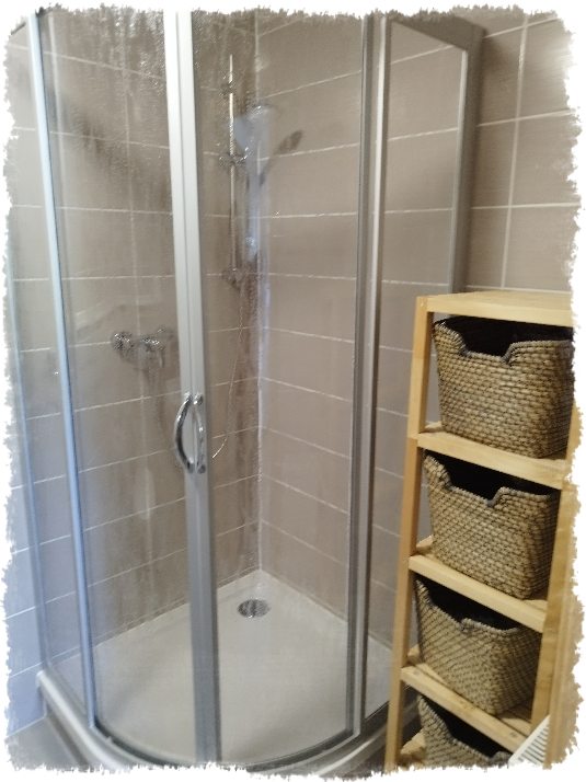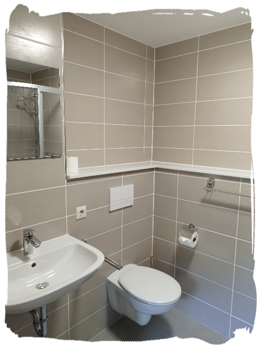 Zur Ausstattung unserer Ferienwohnung gehören ein Badezimmer mit WC, Dusche und Waschtisch.
